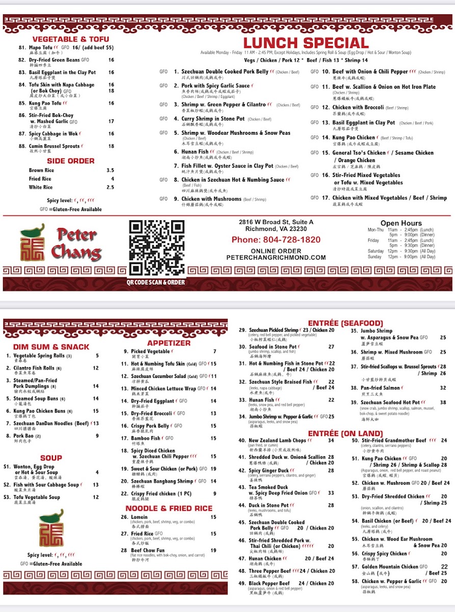 Welcome to Peter Chang, an exquisite culinary destination at 2816 W Broad St A, Richmond, VA. Celebrated for its authentic flavors and vibrant dishes, Peter Chang offers a delightful menu that showcases an array of small plates, dim sum, and noodle specialties. Highlights include the sizzling Szechuan Fish and richly flavored Double Cooked Pork Belly. Each plate bursts with spices and textures, reflecting the true essence of Asian cuisine.